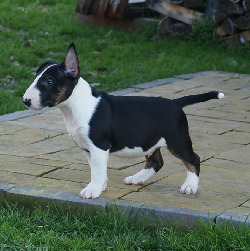 Terri personifica lo mejor de los Bull Terrier Miniatura en venta en Europa, demostrando que el espíritu valiente y cariñoso del Bull Terrier puede venir en un paquete compacto. Criado en nuestras instalaciones especializadas en Alemania por expertos en la variante miniatura, su desarrollo ha seguido protocolos específicos que garantizan su salud y proporciones perfectas. Cada etapa de su crecimiento ha estado enfocada en preservar las características únicas del Bull Terrier en un formato más manejable para la vida moderna.